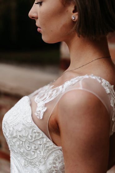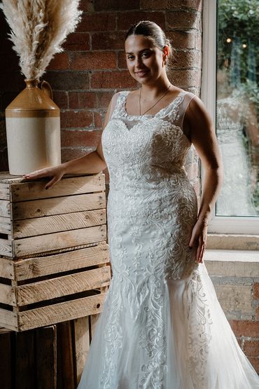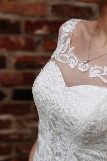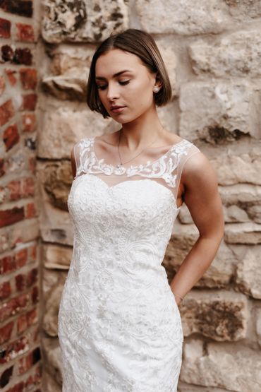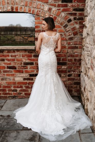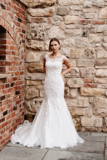 The WD115 is a delicate fishtail gown with a stunning all-over lace patterning. With her structured, fitted bodice and dramatic flared skirt, she creates a stunning silhouette on every figure. The delicate illusion neckline and back detail are truly unique. Available in Ivory & Blush