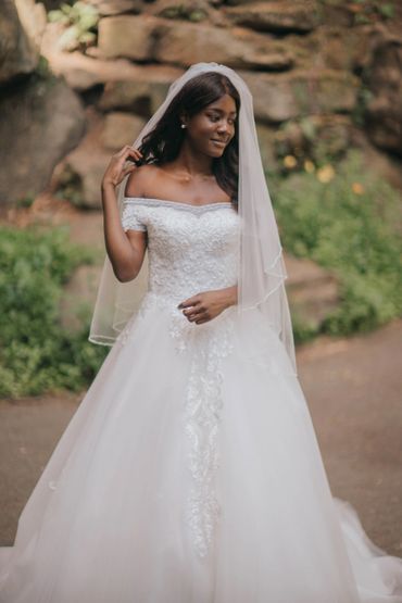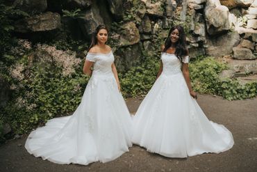 This Disney-inspired princess gown is adorned with lace and delicate sparkles. The detailed off-the-shoulder bodice is a firm favourite among brides. The A-line cut is flattering on the brides figure, and the corseted back cinches the waist - as well as adding extra beautiful detail in the back. This gown is available with or without a train.